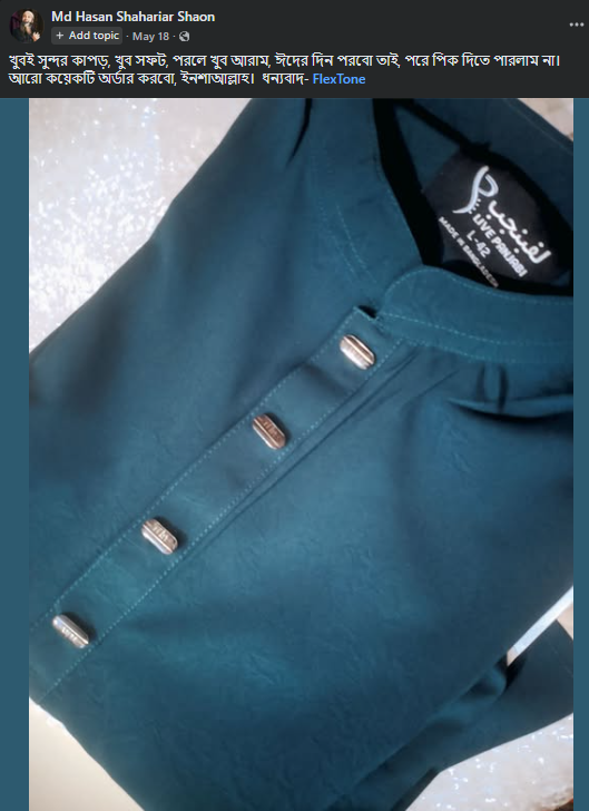 𝐏𝐫𝐨𝐝𝐮𝐜𝐭 𝐃𝐞𝐭𝐚𝐢𝐥𝐬 𝐨𝐟 𝐅𝐥𝐞𝐱𝐓𝐨𝐧𝐞Product Type: Panjabi 𝐅𝐚𝐛𝐫𝐢𝐜: প্রিমিয়াম মাইক্রোস্টিজ Type: Semi-Long Production Country: Bangladesh 𝐁𝐮𝐭𝐭𝐨𝐧 𝐓𝐲𝐩𝐞: 𝐒𝐧𝐚𝐩 𝐁𝐮𝐭𝐭𝐨𝐧(𝐓𝐢𝐩 𝐛𝐮𝐭𝐭𝐨𝐧) Style: Casual Gender: Men𝐒𝐢𝐳𝐞 𝐂𝐡𝐚𝐫𝐭S: 38✅ Long - 38, Body- 40M: 40✅ Long - 40, Body- 42L: 42✅ Long - 42, Body- 44XL: 44✅ Long - 44, Body- 46XXL: 46✅Long - 46, Body- 48𝟑 𝐃𝐚𝐲𝐬 𝐑𝐞𝐭𝐮𝐫𝐧 𝐏𝐨𝐥𝐢𝐜𝐲𝐂𝐚𝐥𝐥 & 𝐖𝐡𝐚𝐭𝐬𝐀𝐩𝐩: 01827788227